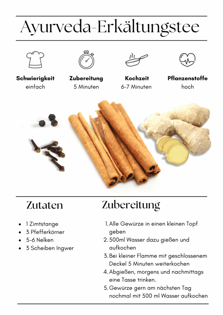 Der Ayurvedische Erkältungstee: Nicht nur aus meinem Youtube-Video „Schnupfen adé: So helfen Kochsalz und Gewürze gegen die Viren“ – schmeckt und lindert die Erkältungssymptome. Schau dir das Video an!